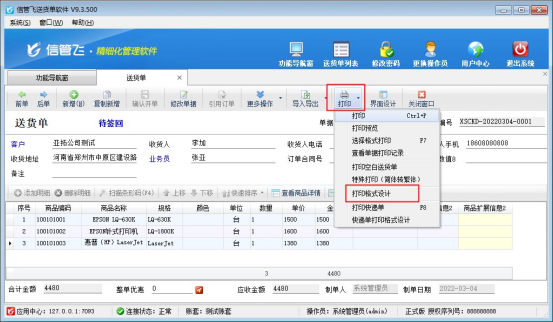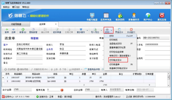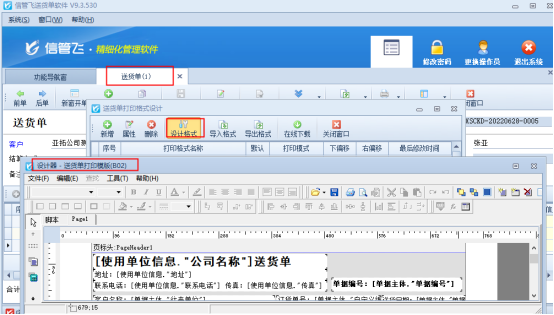 ????以信管飛送貨單軟件為例,示范下如何調(diào)整模板的頁邊距。功能導(dǎo)航窗選擇“業(yè)務(wù)處理”—》“新開送貨單”界面,開單保存后,在打印按鈕下選擇打印格式設(shè)計,可進(jìn)入打印格式設(shè)計界面,如下圖所示: