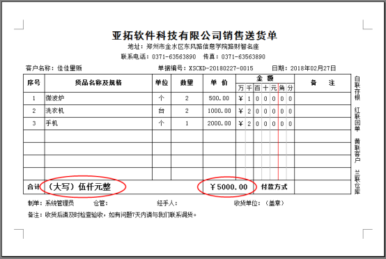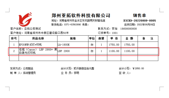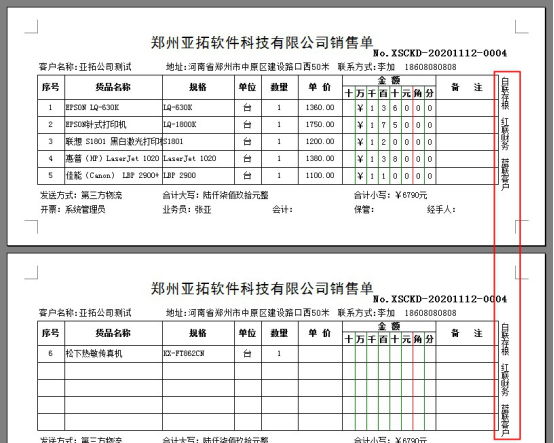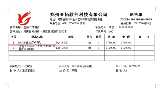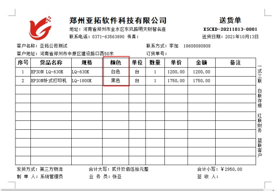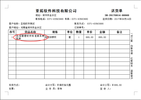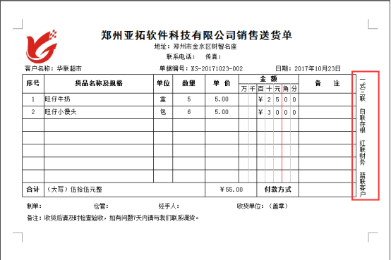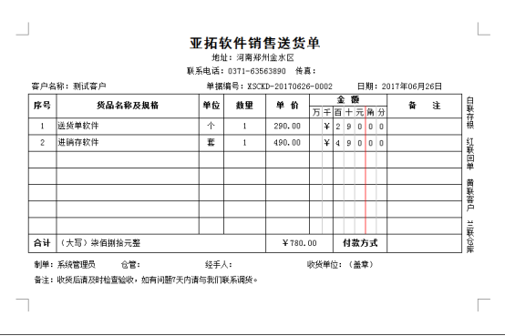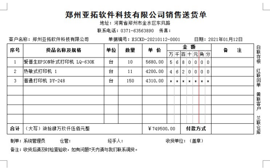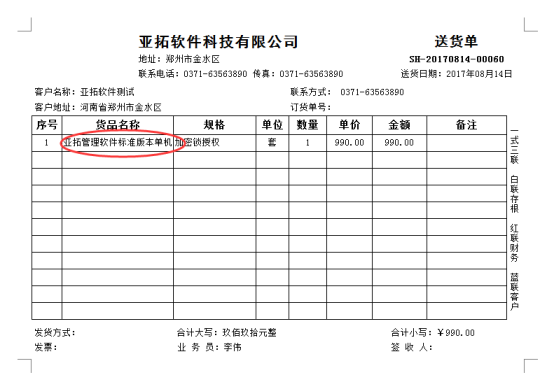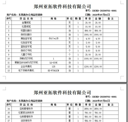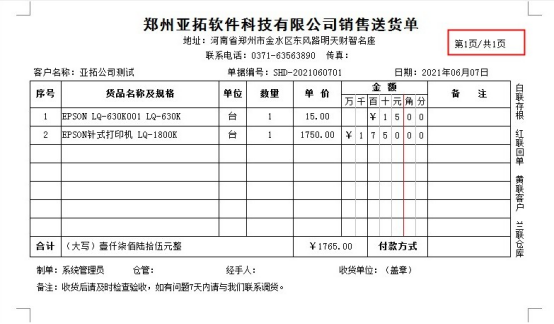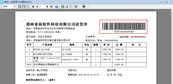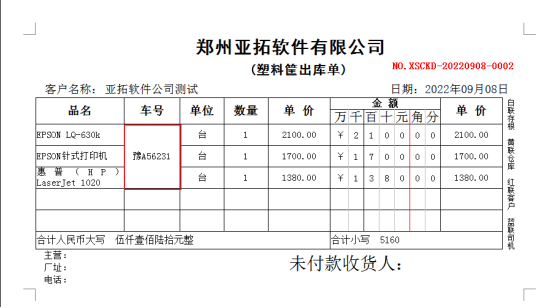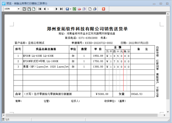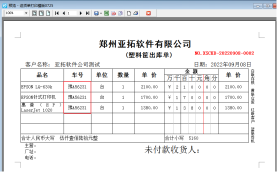 ????軟件默認(rèn)打印格式的單位是調(diào)用的系統(tǒng)管理-使用單位信息,系統(tǒng)管理-系統(tǒng)參數(shù)中添加好單位信息后,模板會自動調(diào)用顯示,示例單位名稱為:鄭州亞拓軟件科技有限公司,模板預(yù)覽圖如下圖所示:
