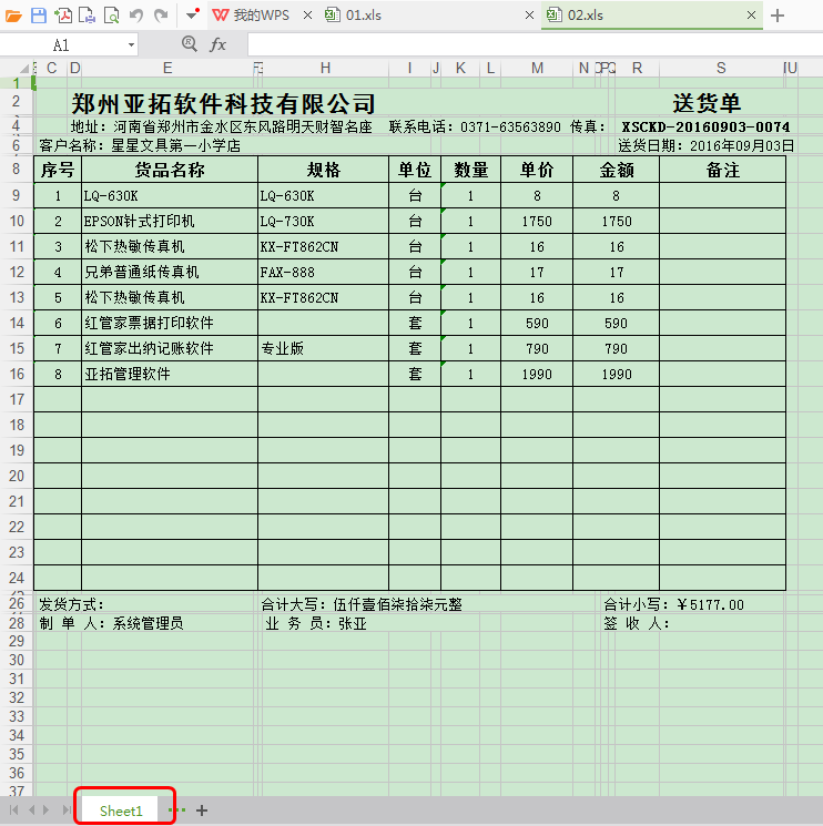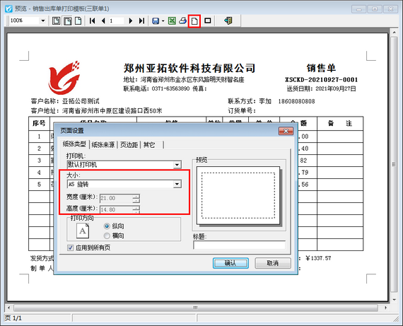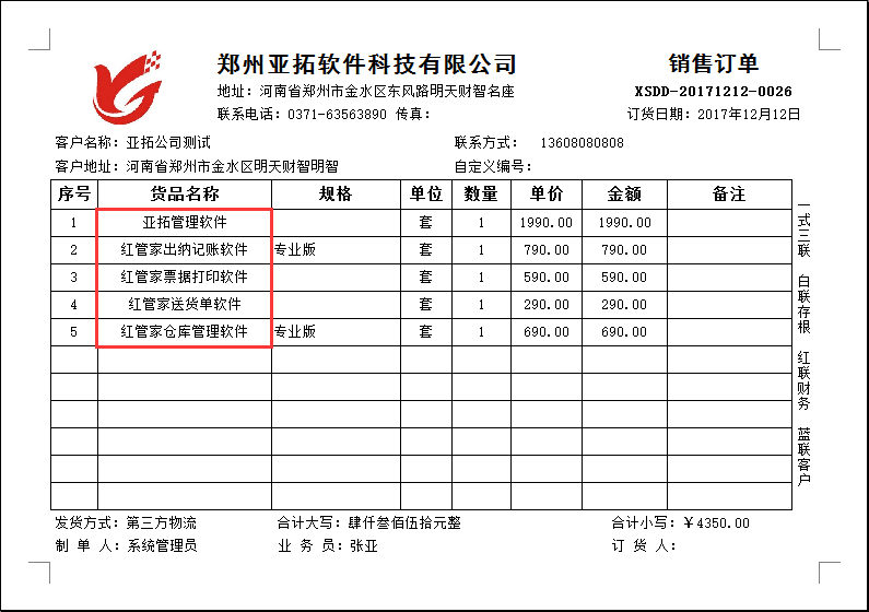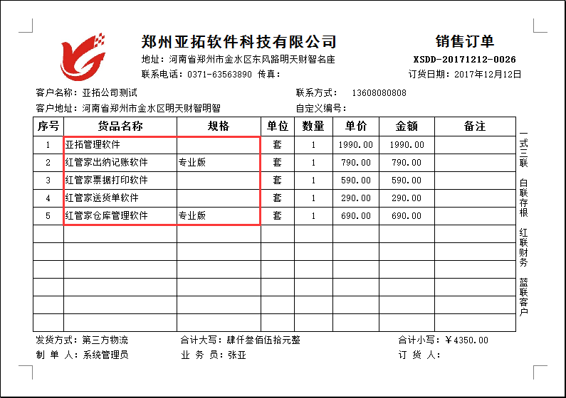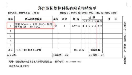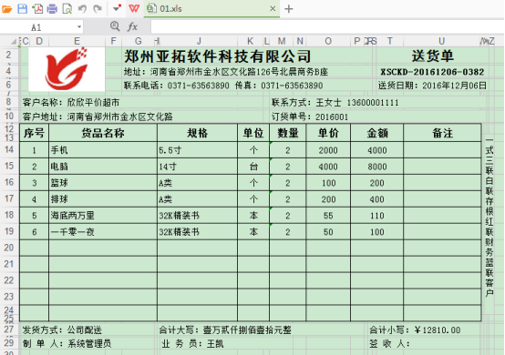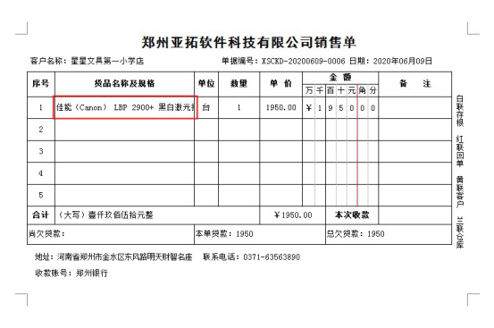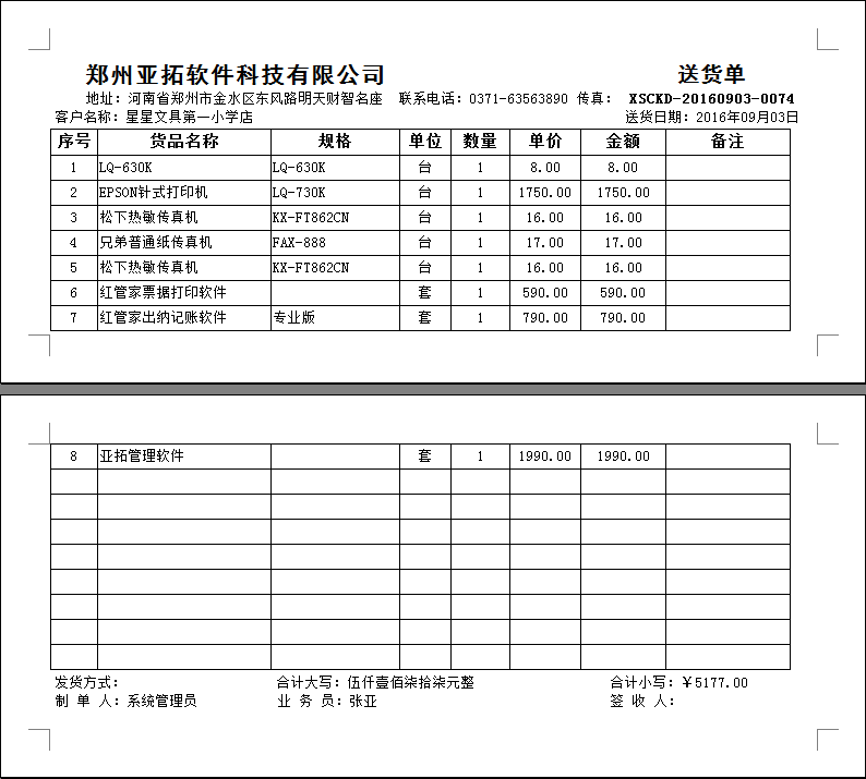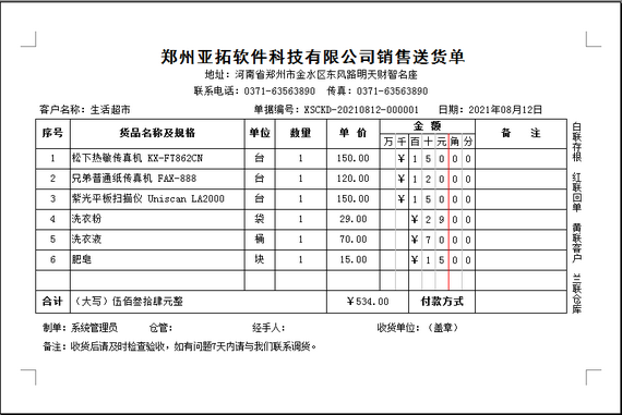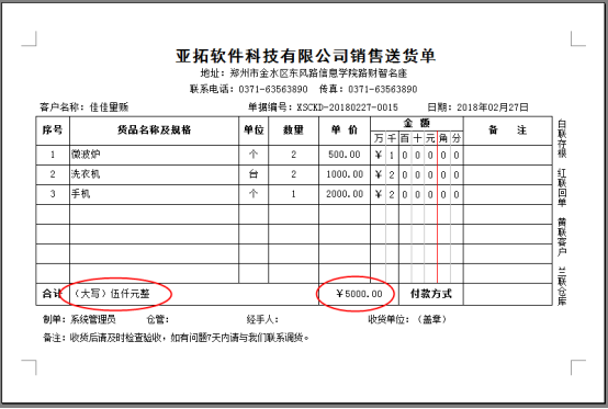 ????軟件默認(rèn)打印格式的單位是調(diào)用的系統(tǒng)管理-使用單位信息,系統(tǒng)管理-系統(tǒng)參數(shù)中添加好單位信息后,模板會自動調(diào)用顯示,示例單位名稱為:鄭州亞拓軟件科技有限公司,模板預(yù)覽圖如下圖所示: