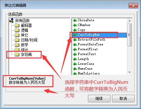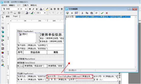 ????打開模版設(shè)計界面后,在模版合適的位置添加一個文本框,雙擊文本框打開文本編輯器,然后錄入內(nèi)容“[CurrToBigNum([RMRound([單據(jù)主體."應(yīng)收應(yīng)付金額"],2)])]”或者是通過“插入表達(dá)式”插入數(shù)字轉(zhuǎn)換人民幣大寫函數(shù),如下圖所示。