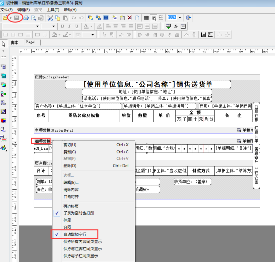 ????設(shè)置不顯示空白行,為了避免修改錯誤,可以在打印格式設(shè)計界面,選擇模板點擊工具欄中的“復(fù)制”按鈕,會自動復(fù)制一份打印模板,選擇復(fù)制打印模板,點擊“設(shè)計格式”進(jìn)入打印模板設(shè)計器界面,在“細(xì)項數(shù)據(jù)”欄上(如沒有細(xì)項數(shù)據(jù)則選擇主項數(shù)據(jù)),點擊右鍵把“自動增加空行”的勾選符號去掉,然后保存打印模板即可。如下圖所示: