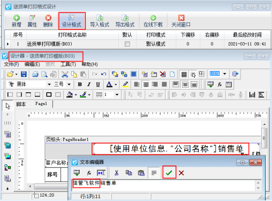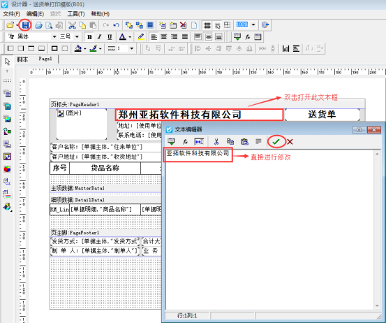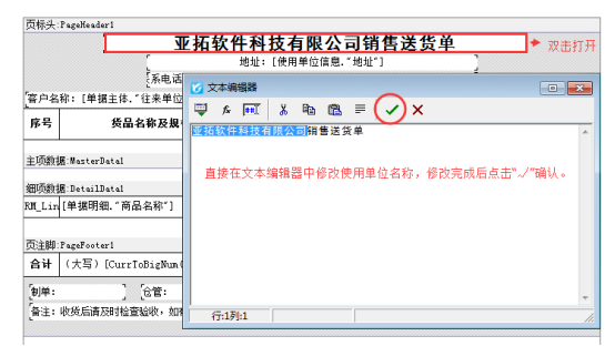 ????打開“設(shè)計格式”,在設(shè)計器界面,雙擊打開固定的單位名稱文本框,直接在文本編輯器中進(jìn)行修改單位名稱,修改好后點擊“√”確定,然后保存模板。則固定單位名稱的打印模板修改完成。如下圖所示: