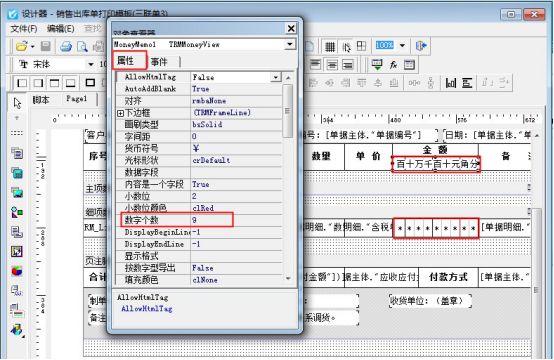 ????打開送貨單開單界面,點擊工具欄“打印”按鈕下的“打印格式設(shè)計”,進(jìn)入打印格式設(shè)計界面,選擇打印模板后點擊“設(shè)計格式”進(jìn)入模板設(shè)計器界面。在模板設(shè)計器界面。選擇金額文本框,鼠標(biāo)右鍵選擇“屬性”,彈出屬性界面上找到數(shù)字個數(shù)修改為9(對應(yīng)的單據(jù)明細(xì)中的金額也用相同的方式修改下數(shù)字個數(shù)為9),保存后金額會顯示到百萬,如下圖所示:
