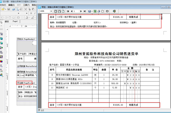 ????以“信管飛送貨單軟件”為例,打開一個已開送貨單,點擊打印按鈕下的打印格式設(shè)計進(jìn)入打印格式設(shè)計界面,選擇默認(rèn)模板銷售出庫單打印模板(三聯(lián)單3)后打開設(shè)計格式界面,點擊打印預(yù)覽界面可以看到模板的合計都是每頁都顯示的,如下圖所示: