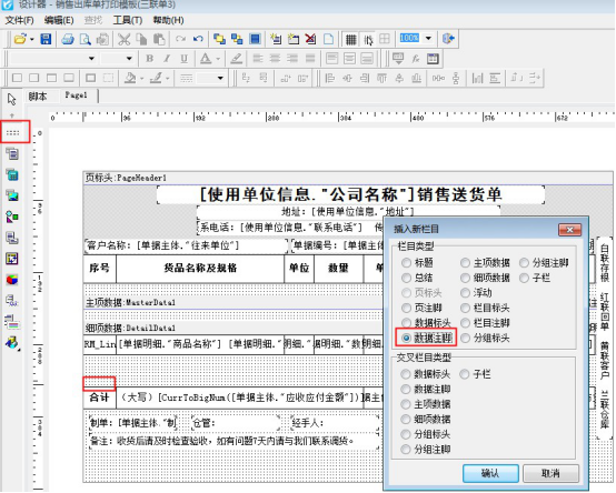????需要合計在最后一頁顯示,需要把“頁注腳”換為“數(shù)據(jù)注腳”,在模板設(shè)計器界面,點擊“頁注腳”進(jìn)行刪除,然后點擊左側(cè)工具欄的第一項,選擇“數(shù)據(jù)注腳”,添加到合計的位置處,如下圖所示: