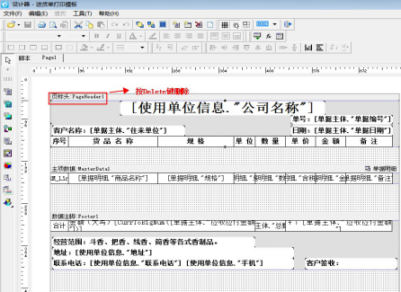 ????打開已開送貨單界面,在工具欄點擊打印—》打印格式設(shè)計進(jìn)入打印格式設(shè)計界面,選擇模板點擊“設(shè)計格式”,進(jìn)入模板設(shè)計器界面,在模板設(shè)計器中,單擊頁標(biāo)頭,按Delete鍵刪除頁標(biāo)頭,然后左邊工具欄點擊“插入邊框”,在表頭處插入“標(biāo)題”,然后往下拖動,覆蓋所有表頭內(nèi)容,保存模板即可。如下圖所示: