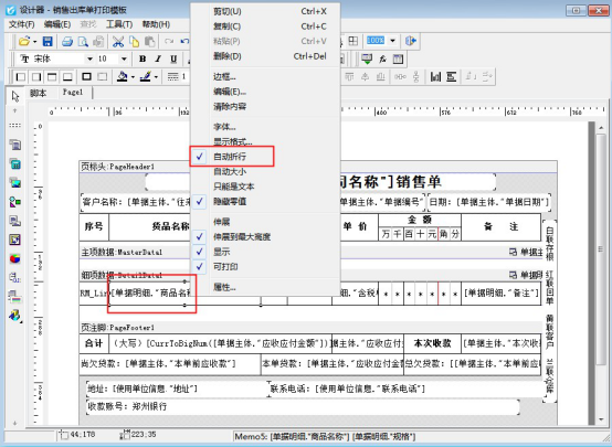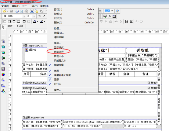 ????在開單界面,打印按鈕下點擊“打印格式設(shè)計”,在打印格式設(shè)計界面,點擊“設(shè)計格式”,可進(jìn)入模板設(shè)計器界面,首先點擊文本框,點擊鼠標(biāo)右鍵可設(shè)置下自動折行,然后把單據(jù)明細(xì)中的文本框點擊后鼠標(biāo)右鍵把“伸展”勾選上,如下圖所示: