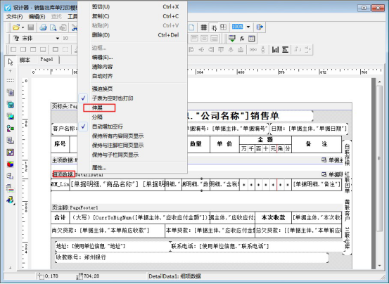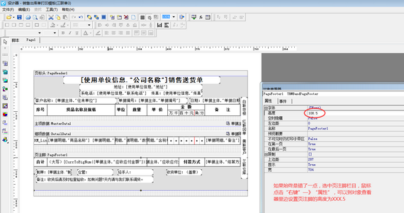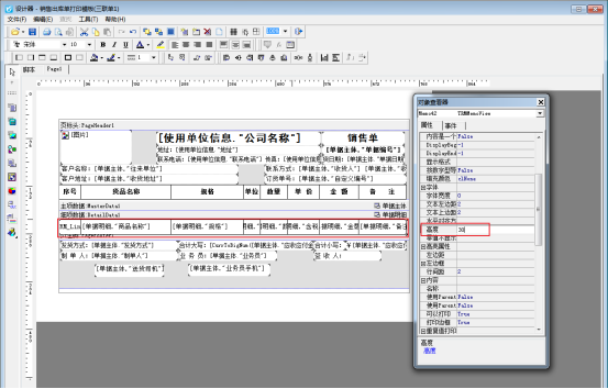 ????在開單界面,打印按鈕下點擊“打印格式設(shè)計”,在打印格式設(shè)計界面,點擊“設(shè)計格式”,可進(jìn)入模板設(shè)計器界面,首先按住ctrl鍵,鼠標(biāo)選中細(xì)項數(shù)據(jù)的所有文本框,右鍵點擊屬性,在屬性中找到高度,可以修改文本框的高度值;設(shè)置完成后,點擊細(xì)項數(shù)據(jù)處,右鍵點擊屬性,修改明細(xì)欄高度與之前文本框的高度一致,如下圖所示: