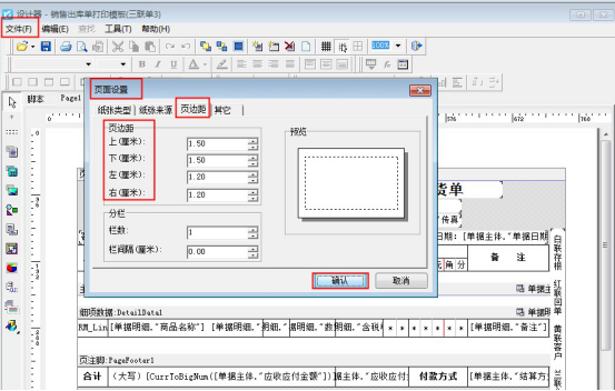 ????在打印格式設(shè)計界面,點擊“設(shè)計格式”,在模板設(shè)計器界面,選擇文件下的“頁面設(shè)置”,在頁面設(shè)置界面,選擇“頁邊距”,可以調(diào)整顯示的邊距大小(軟件默認(rèn)邊距是1.5cm),如下圖所示: