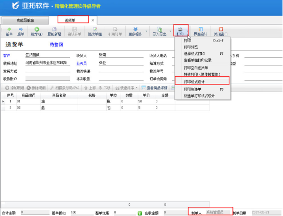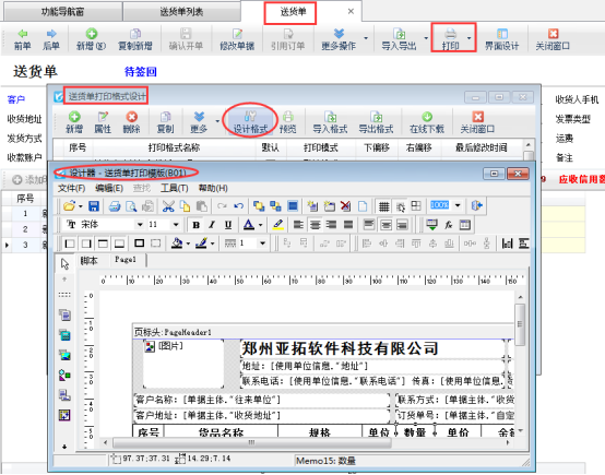 ????新開一個送貨單并保存,選擇客戶“亞拓軟件測試”開單,界面上顯示應(yīng)收款為1750(本單前應(yīng)收款),本單應(yīng)收4330,打印模板上需要顯示客戶欠款,在開單界面打印下選擇“打印格式設(shè)計”,進(jìn)入打印格式設(shè)計界面,點擊設(shè)計格式,進(jìn)入模板設(shè)計器界面添加,如下圖所示: