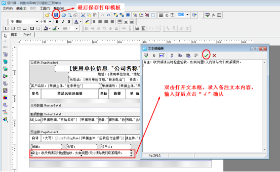 ????在設(shè)計器上,選擇模板下方“備注”文本框,雙擊打開,輸入備注文本內(nèi)容,點擊“√”確定,最后保存打印模板即可。如下圖3所示:
