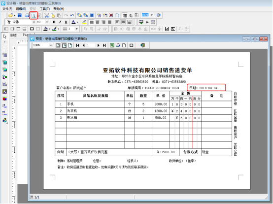 ????登錄軟件,開一個送貨單單據(jù),打印預(yù)覽圖和單據(jù)界面如圖所示,模板界面日期顯示的是“2018年04月04日”,下面我們把日期格式修改為“2018-04-04”顯示。