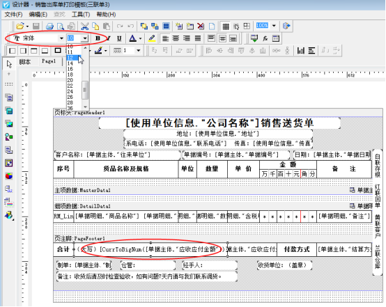 ????在送貨單界面選擇“打印”—》“打印格式設(shè)計”進(jìn)入打印格式設(shè)計界面,如當(dāng)前模板為默認(rèn)模板則直接在工具欄點擊“設(shè)計格式”,不是默認(rèn)模板,需要先點擊下模板進(jìn)行選定模板后打開工具欄的“設(shè)計格式”,進(jìn)入打印模板設(shè)計器界面。選擇需要修改的文本框,鼠標(biāo)單機文本框后,對設(shè)計器工具欄“字體”、“字號”、“是否加粗”進(jìn)行選擇。如下圖所示:
