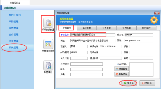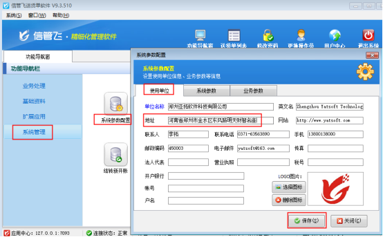 ????修改使用單位地址,需在功能導(dǎo)航窗選擇系統(tǒng)管理—》系統(tǒng)參數(shù)配置—》使用單位信息中修改后保存即可。如下圖所示: