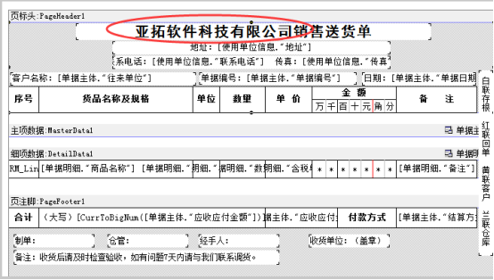 ????一、默認(rèn)模板,公司地址調(diào)用系統(tǒng)參數(shù)使用單位信息中的內(nèi)容,模板設(shè)計界面(開單界面打印下選擇打印格式設(shè)計,設(shè)計格式可查看)如下圖: