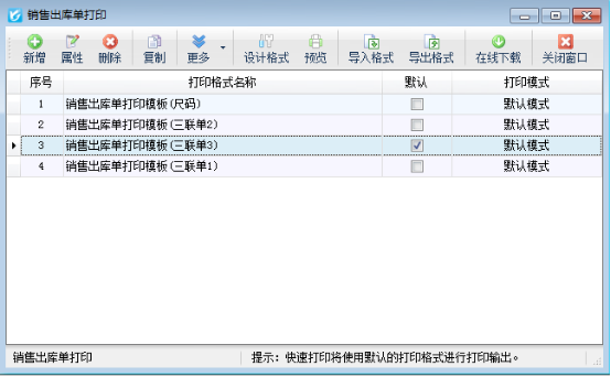 ????以信管飛RMS軟件為例,示范一下如何修改打印格式模版名稱,打開一個已保存的銷售出庫單,在工具欄點擊“打印”—》“打印格式設(shè)計”(圖一)打開“銷售出庫單打印格式設(shè)計”窗口(圖二),選擇“送貨單打印模版(B01)”,然后在工具欄點擊“屬性”按鈕,在打開的“打印格式屬性”窗口即可修改打印模版名稱(圖三)。