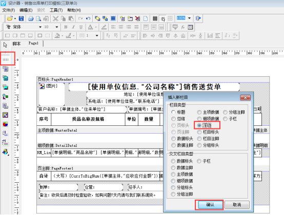 ????如何設(shè)置打印多頁時,每一頁都顯示多聯(lián)備注內(nèi)容,下邊進(jìn)行示范,首先進(jìn)入模板設(shè)計器界面(開單界面打印按鈕下點擊打印格式設(shè)計,在打印格式設(shè)計界面選擇模板點擊設(shè)計格式進(jìn)入設(shè)計器界面),點擊左側(cè)工具欄的“插入邊條”,選擇“浮動”位置放到多聯(lián)備注處,包圍備注內(nèi)容,如下圖所示:
