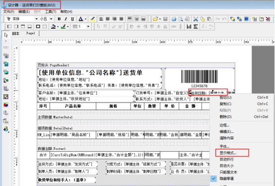 ????在開好的單據(jù)界面點擊“打印”—》“打印格式設(shè)計”—》“設(shè)計格式”,進(jìn)入打印模板設(shè)計器界面,選擇單據(jù)日期文本框,鼠標(biāo)右鍵選擇“顯示格式”,如圖所示。