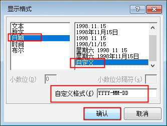 ????打開“顯示格式”窗口,如圖所示,選擇“日期”,選擇需要的日期格式后,點擊“確認(rèn)”按鈕即可。