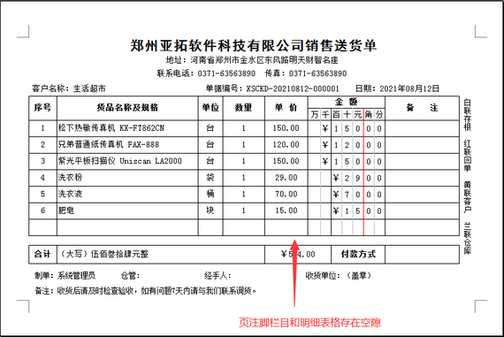 ????信管飛RMS軟件、信管飛送貨單軟件等都支持打印單據(jù),打印模板支持自定義設(shè)計格式,存在多聯(lián)單支持備注多聯(lián)內(nèi)容,單據(jù)開單商品過多會默認(rèn)根據(jù)紙張尺寸打印多頁,有存在多聯(lián)備注在打印第二頁的時候不顯示的情況,如下圖所示: