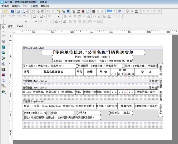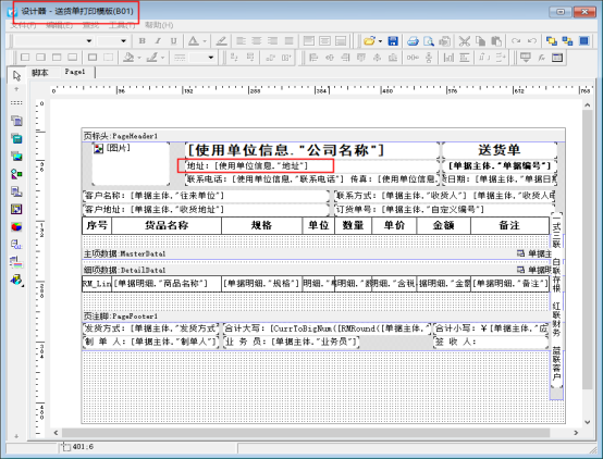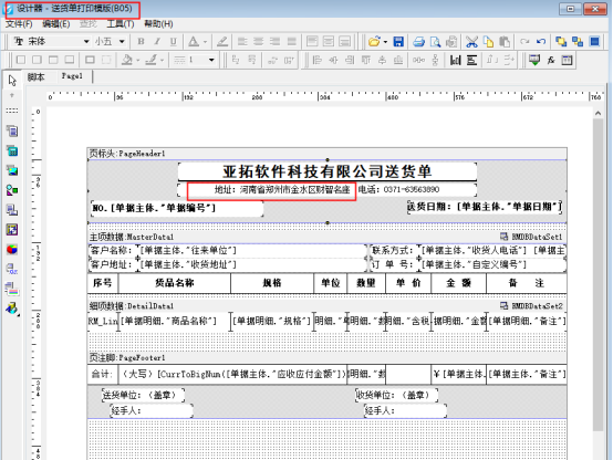 ????功能導(dǎo)航窗點擊“業(yè)務(wù)處理”—》“新開送貨單”,新增并保存一張送貨單單據(jù),工具欄“打印”下點擊“打印格式設(shè)計”,在打印格式設(shè)計界面選擇模板點擊“設(shè)計格式”進(jìn)入打印模板設(shè)計器界面,示例模板:送貨單打印模版(B02),如下圖所示:
