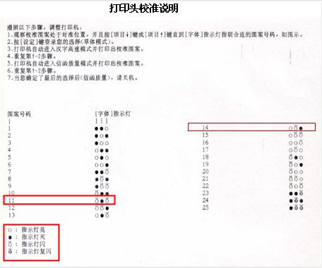 ????從“草體模式下的校準(zhǔn)圖樣”中,根據(jù)打印效果找到豎線最直的圖型。例如:可看出NO.14打印效果較好;使用【項目↓】鍵把字體指示燈調(diào)整成“打印頭校準(zhǔn)說明”所示的狀態(tài)。例如:按NO.14圖樣進(jìn)行校準(zhǔn),使用【項目↓】鍵把字體指示燈調(diào)整“亮閃滅”狀態(tài)。