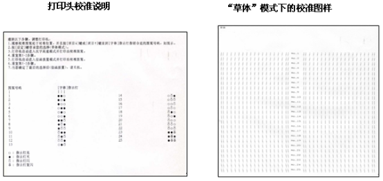 ????確保打印機已經(jīng)關(guān)閉(當(dāng)使用連續(xù)紙時,請確保已裝入打印紙并且打印機已關(guān)閉)。按住【暫停】鍵的同時,打開打印機電源,打印機的缺紙燈和暫停燈亮。放入打印紙,打印出打印頭校準(zhǔn)說明和草體模式下的校準(zhǔn)圖樣,表示已進(jìn)入“草體”校準(zhǔn)模式,如下圖: