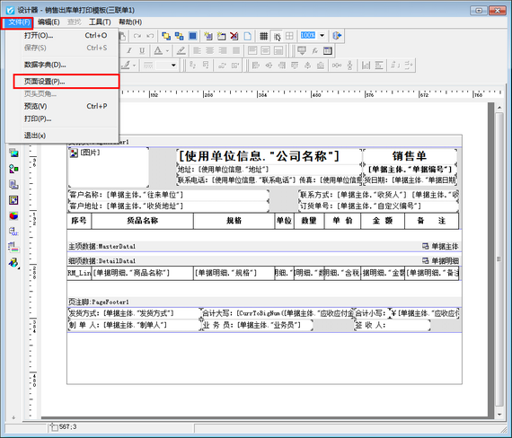 ????在打印格式設(shè)計界面,選擇打印格式模板點擊“設(shè)計格式”,進(jìn)入打印格式設(shè)計器界面。在模板設(shè)計器中點擊左上角“文件”,彈出的界面上點擊“頁面設(shè)置”,進(jìn)入頁面設(shè)置界面,如下圖所示: