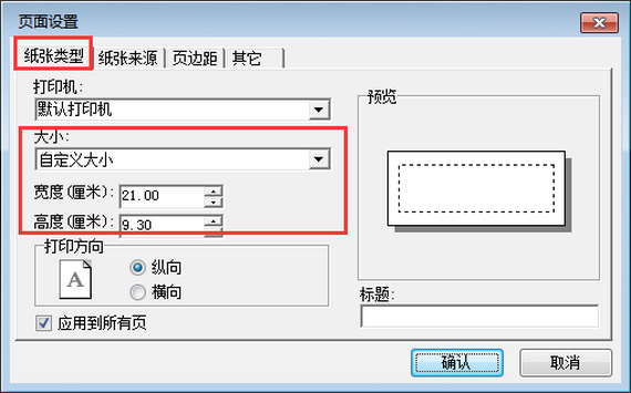 ????模板紙張大小可自定義設(shè)置,也可以選擇里面內(nèi)置的格式,本文示例是選擇“自定義大小”,然后設(shè)置一下寬度和高度,點擊“確認(rèn)”。如下圖所示: