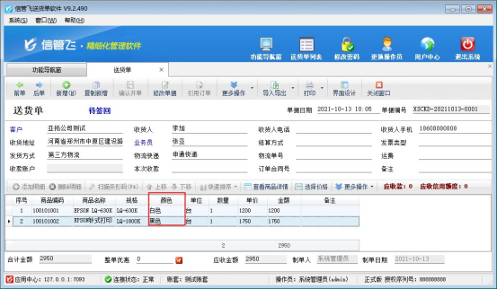 ????送貨單開單界面上新增加一列“顏色”,開單界面如下圖: