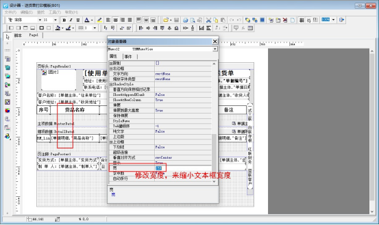 ????如何在打印模板上加上此列?打印模板格式因為尺寸固定,需要增加新的明細(xì)列,要先縮小其他文本框的寬度。在開單界面打印下選擇打印格式設(shè)計,打印格式設(shè)計界面點擊“設(shè)計格式”,進(jìn)入模板設(shè)計器界面,選擇需要縮短寬度的文本框,鼠標(biāo)左鍵單擊選擇文本框(需要多選可按著shift鍵鼠標(biāo)分別單擊,可同時修改兩個文本框),下一步鼠標(biāo)右鍵,選擇屬性,打開“對象查看器”找到寬度,修改寬度,enter鍵確認(rèn),然后關(guān)閉“對象查看器”可看到文本框按寬度修改,如下圖所示: