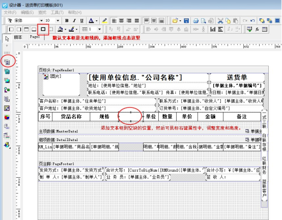 ????需要添加備注內(nèi)容,在送貨單開單界面點擊“打印”下的“打印格式設(shè)計”,選擇模板點擊“設(shè)計格式”,進(jìn)入模板設(shè)計器界面,模板設(shè)計界面選擇左邊工具欄“插入文本框”,然后放置到頁尾處,文本框?qū)挾瓤筛鶕?jù)輸入的內(nèi)容進(jìn)行調(diào)整,如下圖所示: