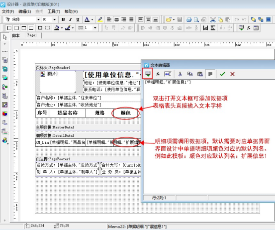 ????文本框添加完成后,雙擊打開文本框進(jìn)行添加數(shù)據(jù),表頭文本框打開輸入文字“顏色”,明細(xì)項文本框調(diào)用數(shù)據(jù)項“[單據(jù)明細(xì)."擴(kuò)展信息1"]”,如下圖所示: