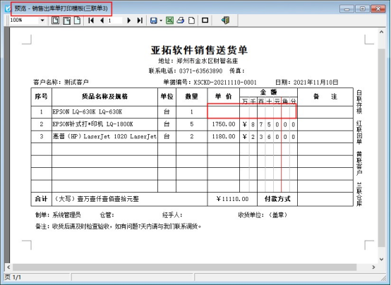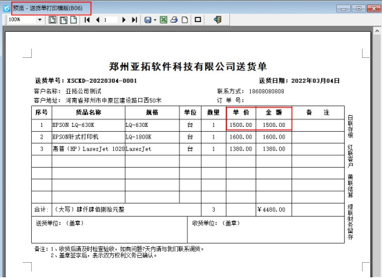 ????新增一個送貨單,保存單據(jù)后預(yù)覽默認(rèn)模板顯示單價和金額,如下圖所示: