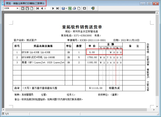 ????金額設(shè)置和單價一樣,設(shè)置完成保存模板,預(yù)覽模板可看到單價和金額的零值已顯示,如下圖: