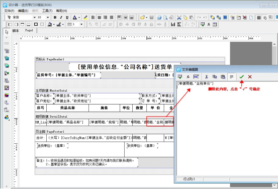 ????在送貨單開單界面,點擊打印按鈕下的“打印格式設(shè)計”,選擇此模板,點擊“設(shè)計格式”進(jìn)入模板設(shè)計器界面。在模板設(shè)計器中,把單價和金額對應(yīng)的明細(xì)數(shù)據(jù)項文本框雙擊打開,把里面調(diào)用的數(shù)據(jù)項刪除,然后保存模板,如下圖所示: