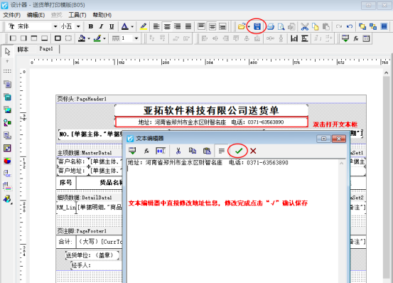????修改直接輸入模板中的地址信息,在開單界面點擊“打印”—》“打印格式設(shè)計”—》選擇打印模板點擊“設(shè)計格式”進(jìn)入設(shè)計格式界面。雙擊打開地址的文本框,修改后點擊“√”確定保存。如下圖所示: