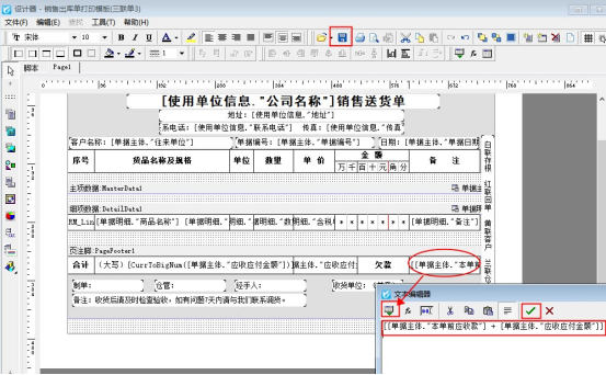 ????在模板設(shè)計器中,新增一個文本框(新增文本框在左側(cè)工具欄添加),打開新建文本框然后輸入名稱:欠款,調(diào)用數(shù)據(jù)項“[[單據(jù)主體."本單前應(yīng)收款"] + [單據(jù)主體."應(yīng)收應(yīng)付金額"]]”,點擊“√”確定保存,如下圖所示: