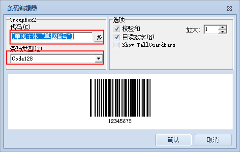 ????需要單據(jù)編號以條形碼形式顯示,在打印模板設(shè)計器界面先刪除原文本框。點擊左側(cè)工具欄最下邊圖標(biāo),下拉列表點擊“Barcode”添加放置到原單據(jù)編號位置,放置完成雙擊打開進(jìn)行配置調(diào)用參數(shù)和條碼類型,如下圖所示: