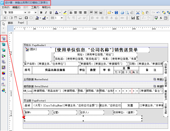 ????打開一個已開的送貨單單據(jù),選擇“打印”按鈕下的“打印格式設(shè)計”,進(jìn)入打印格式設(shè)計界面,選擇“設(shè)計格式”進(jìn)入模板設(shè)計器界面,如下圖所示: