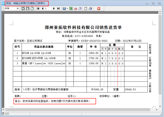 ????備注內(nèi)容可雙擊打開文本框直接輸入,也可以調(diào)用開單界面上的單據(jù)主體內(nèi)容。示例備注直接輸入內(nèi)容,內(nèi)容如下“備注:收貨后請及時檢查驗收,如有問題7天內(nèi)請與我們聯(lián)系調(diào)貨。”添加完成后預(yù)覽模板如下圖:
