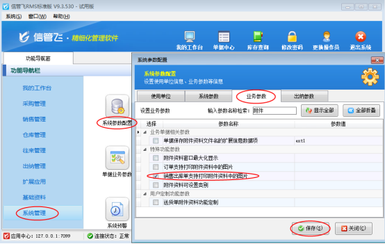 ????在功能導(dǎo)航窗點擊“系統(tǒng)管理”—》“系統(tǒng)參數(shù)”,選擇“業(yè)務(wù)參數(shù)”中的“銷售出庫單支持打印附件資料中的圖片”,勾選參數(shù)并保存配置,如下圖所示: