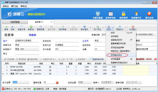 ????信管飛送貨單軟件、信管飛倉庫管理軟件、信管飛RMS都支持開單打印單據(jù),支持打印大寫金額,軟件內(nèi)置有十幾種打印格式模板,同時支持自定義打印格式模板,本篇文章我們以送貨單軟件為例詳細(xì)介紹一下打印模板中如何設(shè)置打印大寫金額?