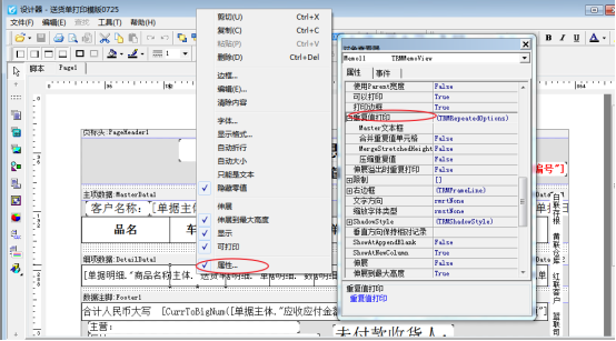 ????在送貨單開單界面,點擊打印按鈕下的“打印格式設(shè)計”,選擇此模板,點擊“設(shè)計格式”進(jìn)入模板設(shè)計器界面。在模板設(shè)計器中,把送貨車號對應(yīng)的明細(xì)數(shù)據(jù)項文本框右鍵屬性打開,把重復(fù)值打印下“合并重復(fù)單元格和壓縮重復(fù)值”改為“TRUE”,然后保存模板,如下圖所示: