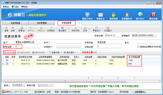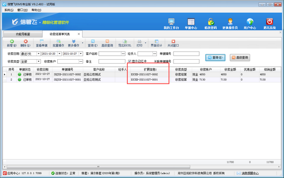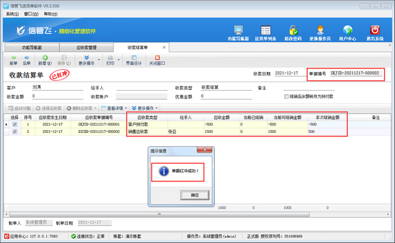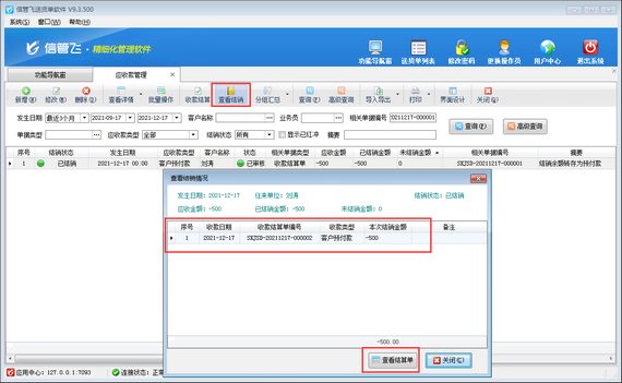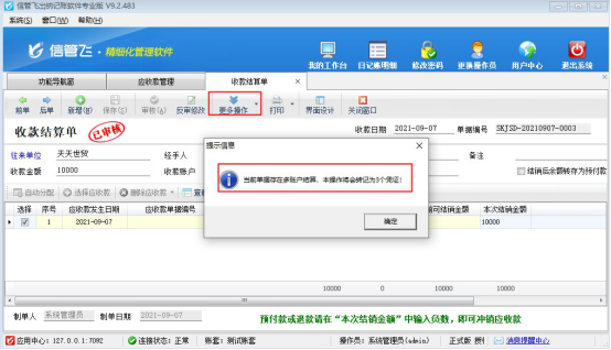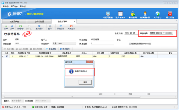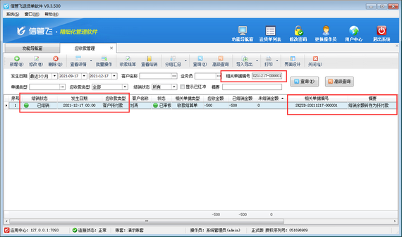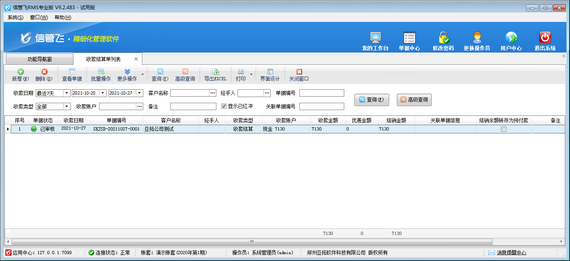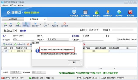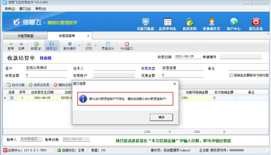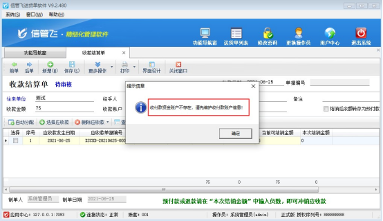 ????信管飛軟件包括信管飛RMS軟件、信管飛出納記賬軟件、信管飛送貨單軟件(送貨單軟件只有應(yīng)收款),支持對應(yīng)收應(yīng)付款進行收付款結(jié)算操作,方便用戶查看收付款情況。對于客戶在結(jié)算時保存不了結(jié)算單,本篇文章以收款結(jié)算單進行示范下如何解決。