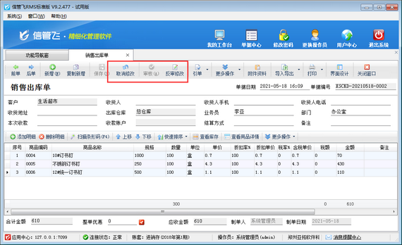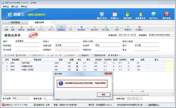????信管飛RMS是進銷存一體化的軟件,支持管理往來應(yīng)收應(yīng)付款,銷售出庫單審核后自動生成銷售應(yīng)收款信息,可以對銷售應(yīng)收款進行收款結(jié)算,如銷售應(yīng)收款已結(jié)銷的情況下,發(fā)現(xiàn)銷售出庫單有填開錯誤,需要修改,系統(tǒng)默認是不能直接進行反審修改操作,如下圖所示。