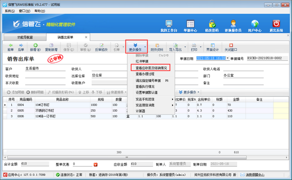 ????需要修改這筆收款結(jié)算單,可點擊工具欄的“更多操作”下的查看相關(guān)單據(jù)(此項只有開單輸入收款金額才會顯示),彈出到銷售開單界面,在銷售單界面點擊“反審修改”按鈕可以修改本次收款金額,如下圖所示: