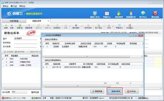????信管飛系列下的送貨單軟件、RMS進銷存軟件等都支持開銷售單和管理銷售單生成的對應(yīng)應(yīng)收款,如存在客戶付款小于此客戶的應(yīng)收賬款時,軟件中該如何對此應(yīng)收款進行結(jié)銷?本文以“信管飛RMS軟件”為例,示范下如何結(jié)算。