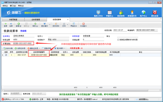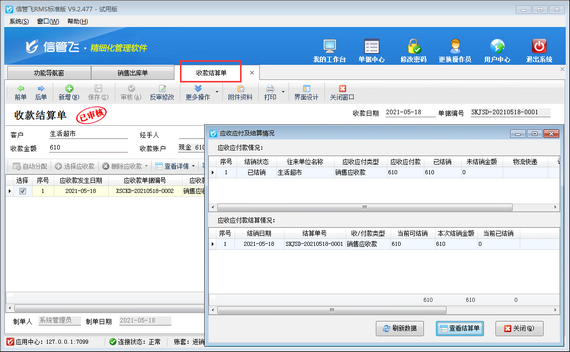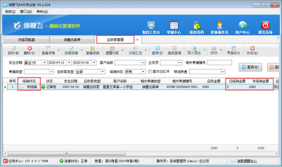 ????結(jié)算單審核完成后會影響應(yīng)收款的結(jié)銷狀態(tài)。如果需要按單據(jù)進行分批結(jié)銷可參考此文章:信管飛RMS 軟件如何按單據(jù)部分結(jié)銷應(yīng)收款?