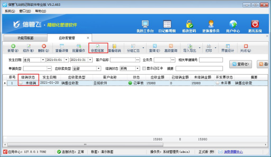 ????點擊“保存”按鈕后,應(yīng)收款管理界面增加一個未結(jié)銷的期初應(yīng)收款記錄,后續(xù)客戶結(jié)銷款后,可以在軟件中結(jié)銷此期初應(yīng)收款,選擇該未結(jié)銷的期初應(yīng)收款,點擊“收款結(jié)算”按鈕就可以結(jié)銷,如下圖2所示: